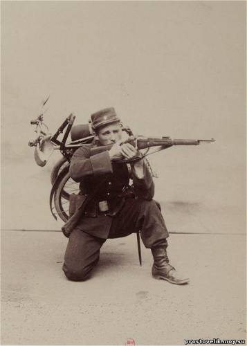 Французский солдат демонстрирует боевое применение складного велосипеда "Гладиатор". Французская компания "Гладиатор" существовала с 1891 г. до начала 1920-х годов, выпуская велосипеды и другие транспортные средства.